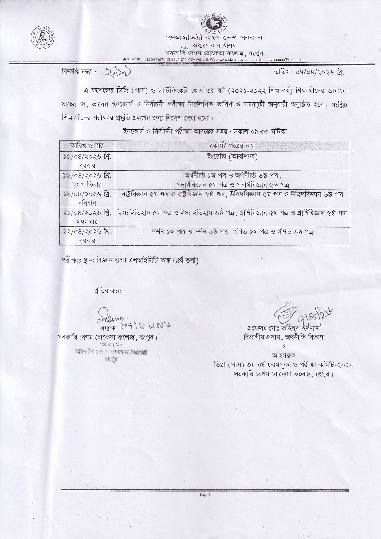 | 1 | ডিগ্রী ৩য় বর্ষ ইনকোর্স ও নির্বাচনী পরীক্ষা | 13/04/2026 | Download |
